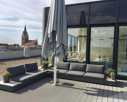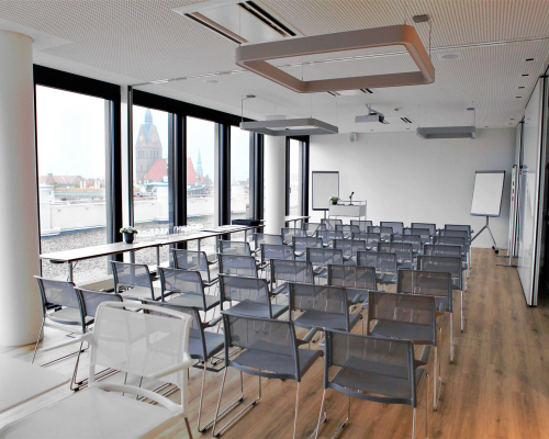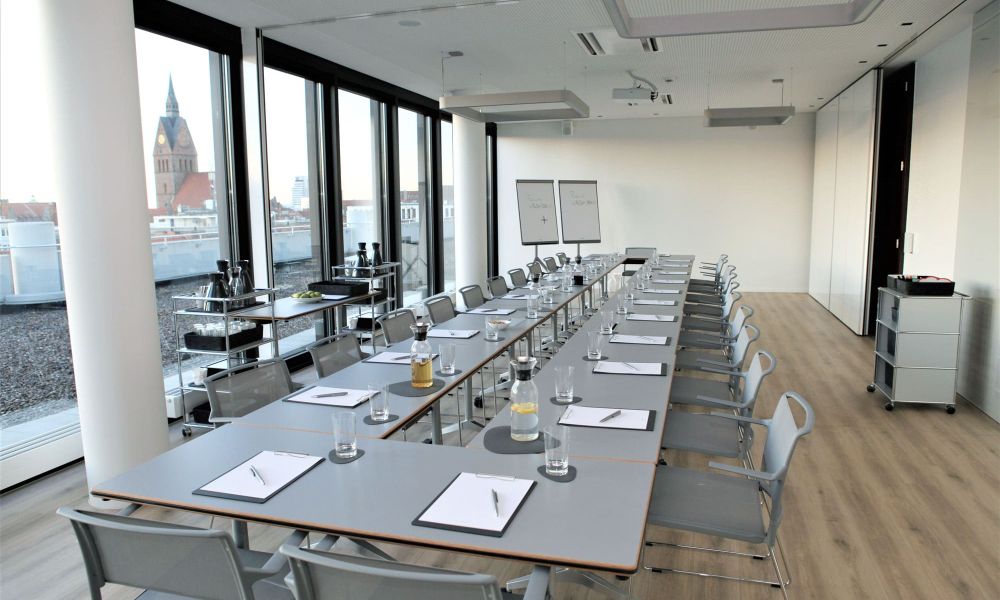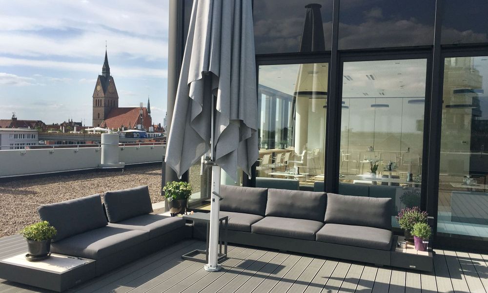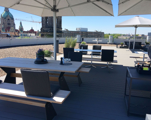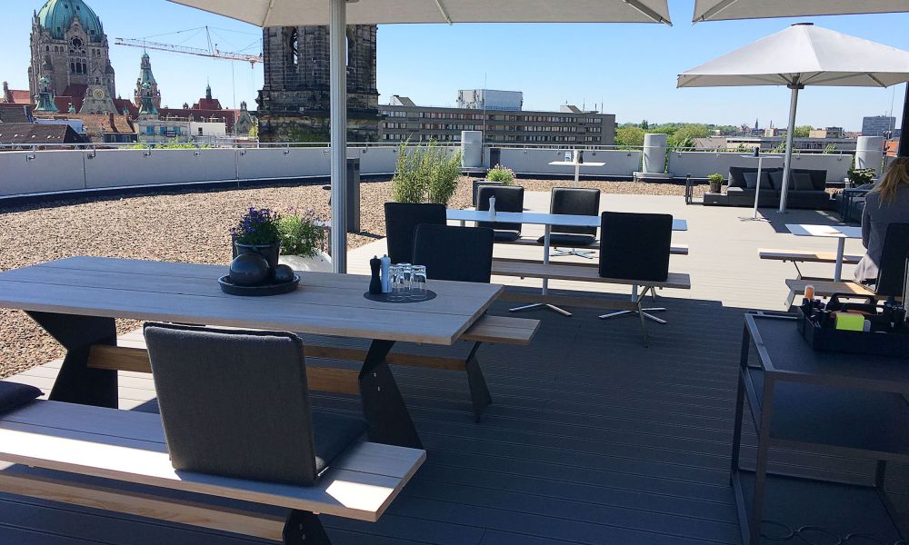 Genießen Sie den Blick aufs Neue Rathaus, die Aegidienkirche bis zum Deister. Völlig abgeschirmt vom Verkehrslärm der Stadt können Sie so auf unserer Dachterrasse tief durchatmen. Dies ermöglicht Ihnen in besonderer Weise ein konzentriertes und ungestörtes Arbeiten.