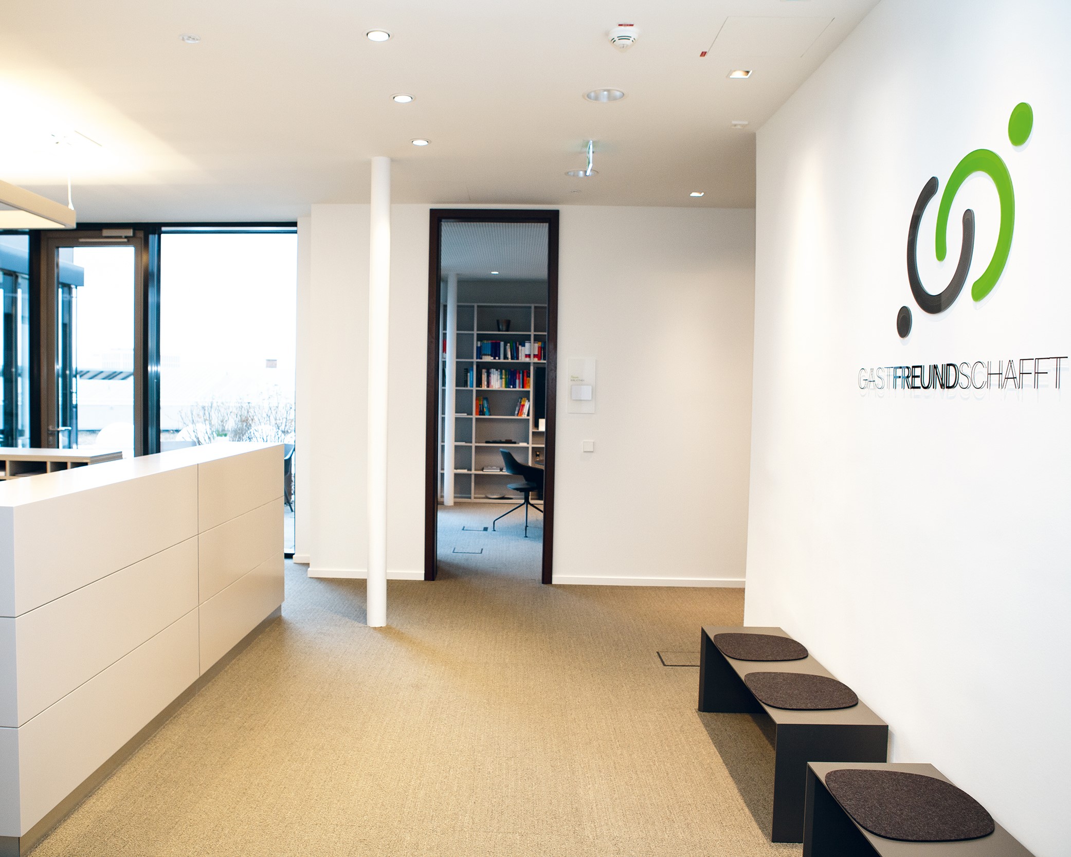 Zur ganzen GASTFREUNDSCHAFFT gehören der Empfang, die besonderen Räume "Bibliothek" und "Entre Nous", die Workshopräume "Wirksam sein I-V", der Flur mit Arbeitsbereichen, die Lounge und die Dachterrasse.