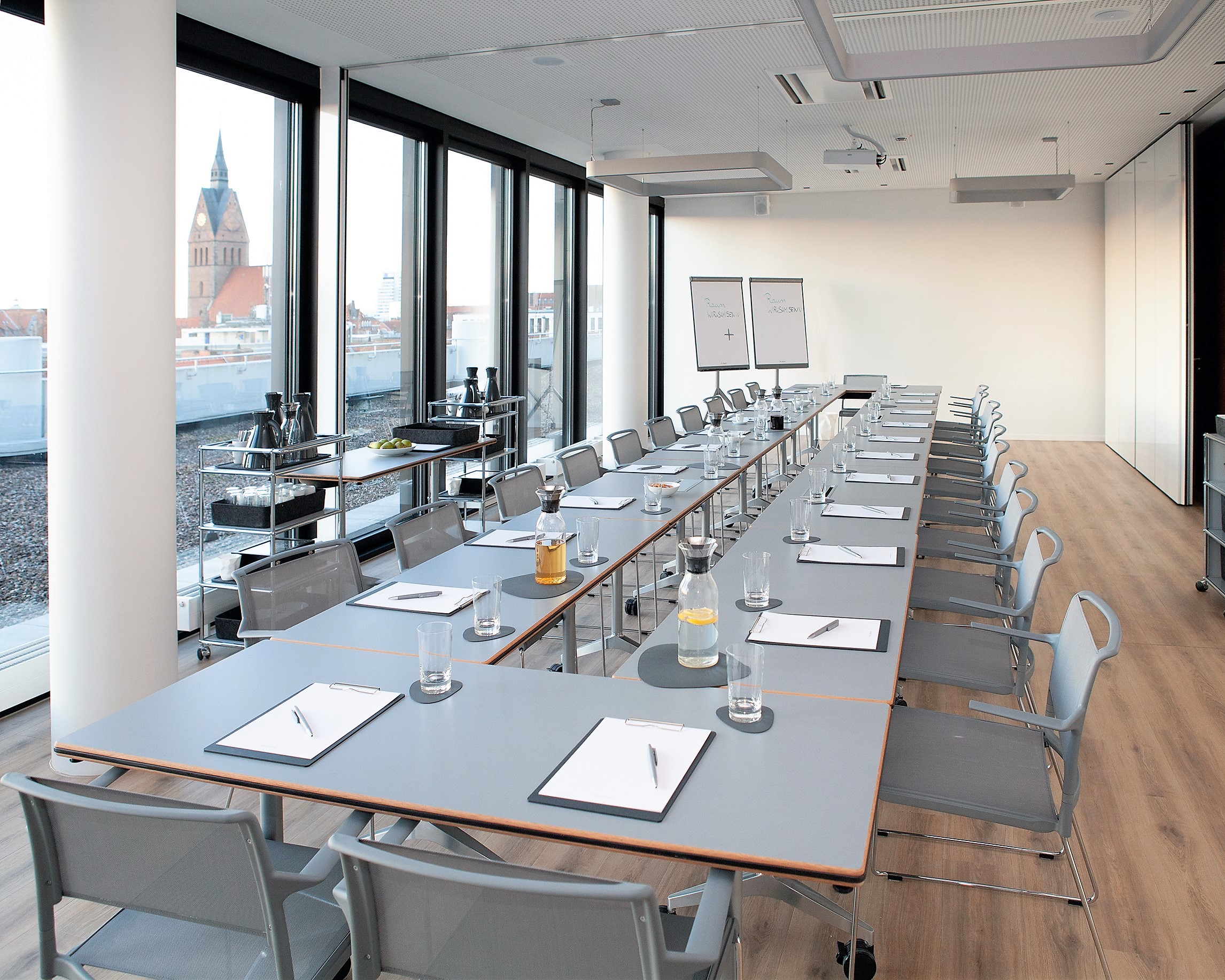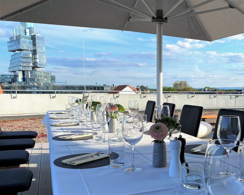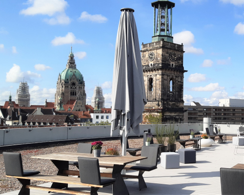 Kommen Sie im Anschluss an Ihre Tagung in unsere Lounge mit einladender, festlicher Atmosphäre und treten Sie hinaus auf unsere Dachterrasse. Genießen Sie den Weitblick über Hannover – auf das Neue Rathaus, die Aegidien- und die Marktkirche.
