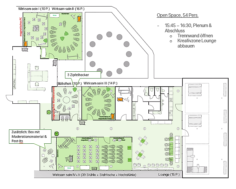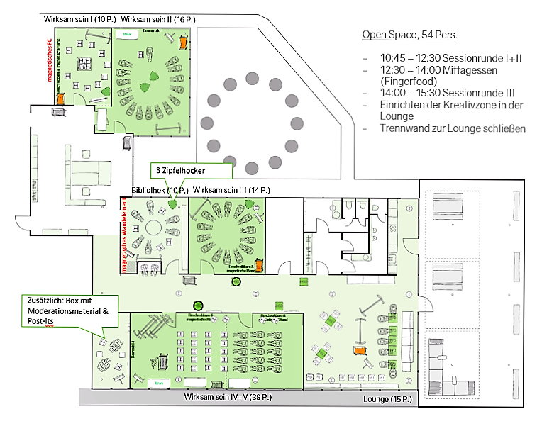Hier finden Sie Beispiele zu Arrangements unterschiedlicher Raumkonzepte in Wirksam sein IV+V und je nach Teilnehmerzahl geöffnet zur Lounge: Vortrag, Parlament, Stuhlkreis, U-Bestuhlung, Kreativ & Arbeitsinseln.