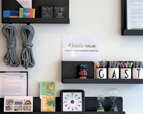 Wir halten weitere Moderationswerkzeuge für Sie in unserem Wandregal bereit. Folgen Sie unserer Maxime "Einfach nutzen. Wirksam arbeiten." Und greifen Sie bei Bedarf zu. Bildkarten, Time timer, Metalog Tools, uvm. warten auf Ihren Einsatz!