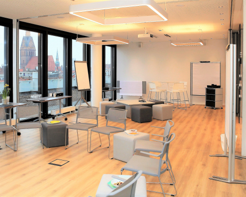 Wir richten Plenum- & Gruppenräume entsprechend Ihres Anliegens für Sie ein. So verwandeln sich unsere Räume gerne je nach Wahl der Möblierung, der Raumkonzepte und der zu nutzenden Technik. Beziehungsorientiertes Arbeiten - ganz ohne Technik - gehört genauso dazu, wie technisch voll ausgestattetes Tagen mit Zuschaltung von TeilnehmerInnen und Nutzung der Touch-Monitore, der Einrichtung von Beamer / Bildschirm sowie dem Einsatz von Mikrophonen. Auch das Arragieren der benötigten Kreativflächen ist uns wichtig inklusive der Vorbereitung entsprechender Moderationsmaterialien pro Teilnehmer in den Gruppenräumen.
