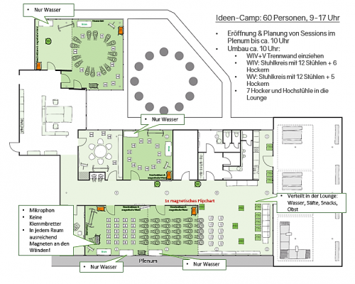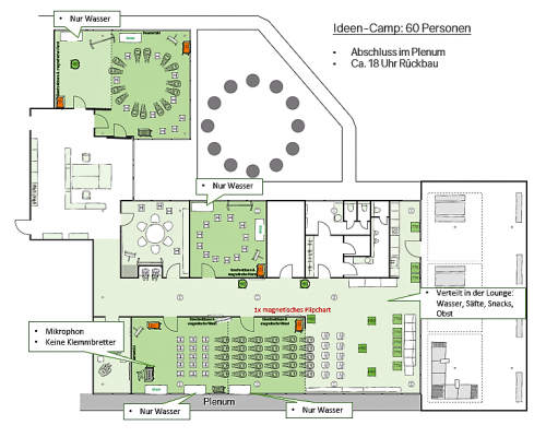 Nach der genauen Absprache arbeiten wir für Sie & unser Team detaillierte Raumpläne aus. Diese aktualisieren wir bei Anpassungsbedarf bis zum Tag der Tagung. Diese Pläne dienen zum einen der Visualisierung von Raumkonzepten, ausgewählten Möbeln, Technik & Kreativzonen intern bei Ihnen, zum anderen zur genauen Abstimmung der Raumwechsel und Umbauten mit Ihrer Agenda.