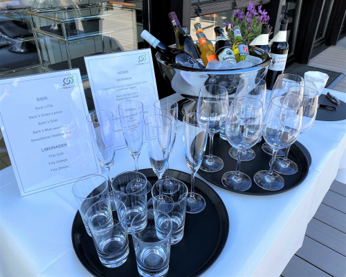 Wir reichen Ihnen dem Anlass entsprechend und nach Ihrer Auswahl verschiedene alkoholische und nicht-alkoholische Getränke, wie Champagner, Prosecco, Weiß- und Rotweine, Bier & Limonaden. Wie gewohnt stehen Ihnen Wasser - still & mit Sprudel – unsere Bio-Säfte, Tee & leckere Kaffeespezialitäten unbegrenzt zur Verfügung. Haben Sie weiteren Bedarf – sprechen Sie uns gerne an!
