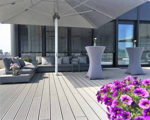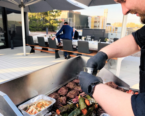 Sobald und solange es warm ist, bietet sich unser Grill-Buffet an - Weitblick & Sommer-Feeling inklusive. Hier wird festlich auf unserer großen Dachterrasse eingedeckt. Stehtische & Loungesofa laden unsere Gäste ein, zu entspannen und gut miteinander in Kontakt zu sein. Sollte es doch zu ungemütlich sein, wird draußen weitergegrillt und in der Lounge gespeist.