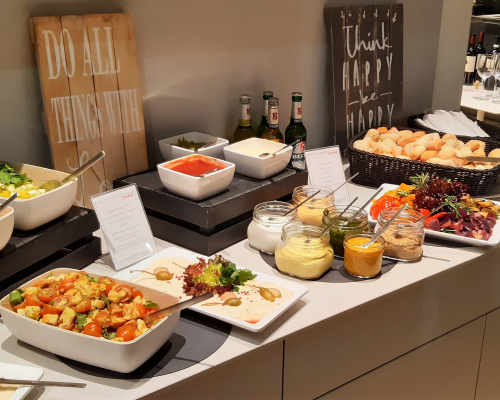 Soll der kulinarische Genuss lieber klassisch und variantenreich gehalten werden, empfiehlt sich unser Buffet. Dieses besteht aus einer Suppe, die mit verschiedenen Toppings verfeinert wird. Zudem wird eine Salatvariation angeboten. Verschiedene warme Gerichte, natürlich mit vegetarischen Auswahlmöglichkeiten, runden den Genuss ab. Vegane Gerichte können ebenso ergänzt werden, wie eine Käsevariation zum Nachtisch. Guten Appetit!
