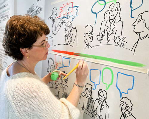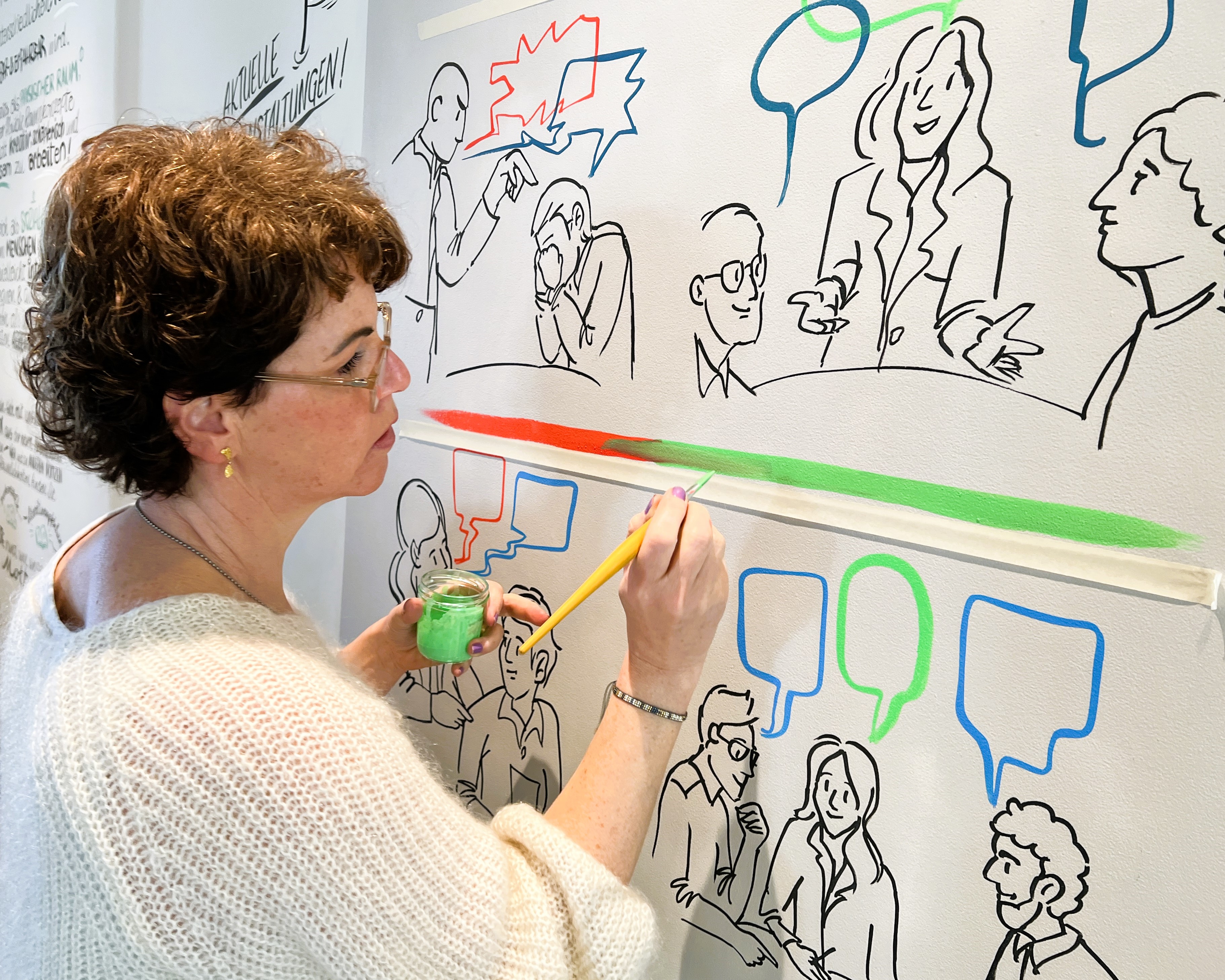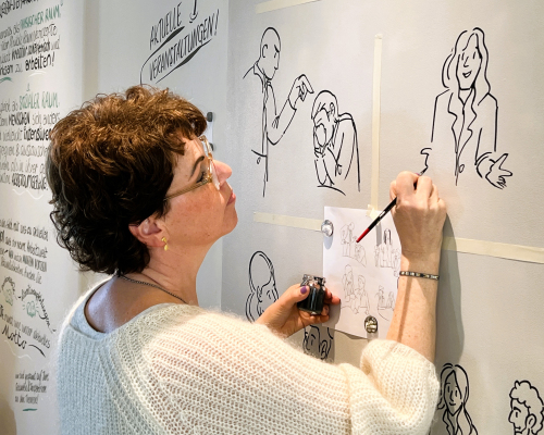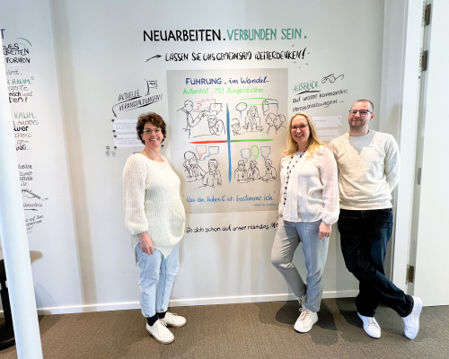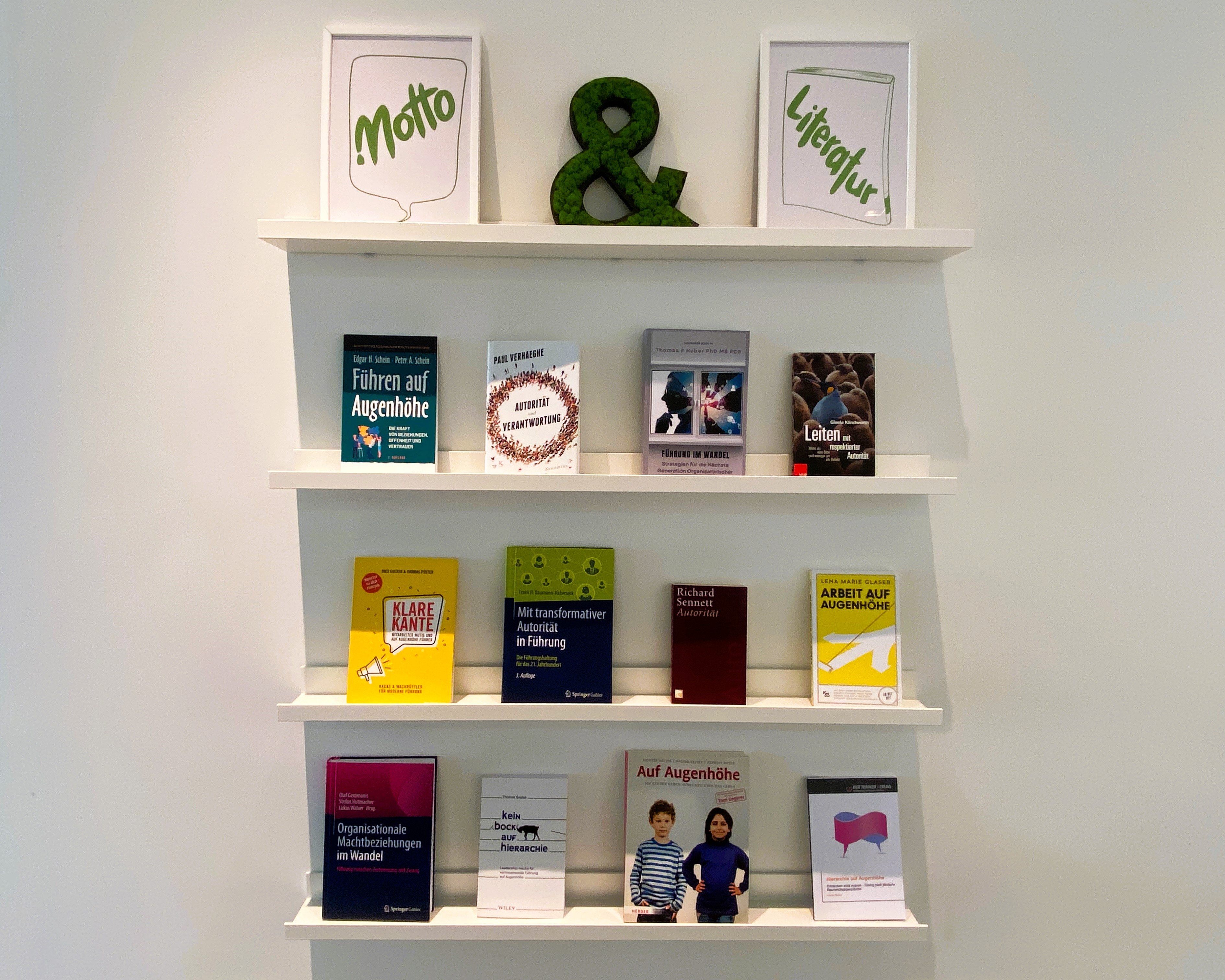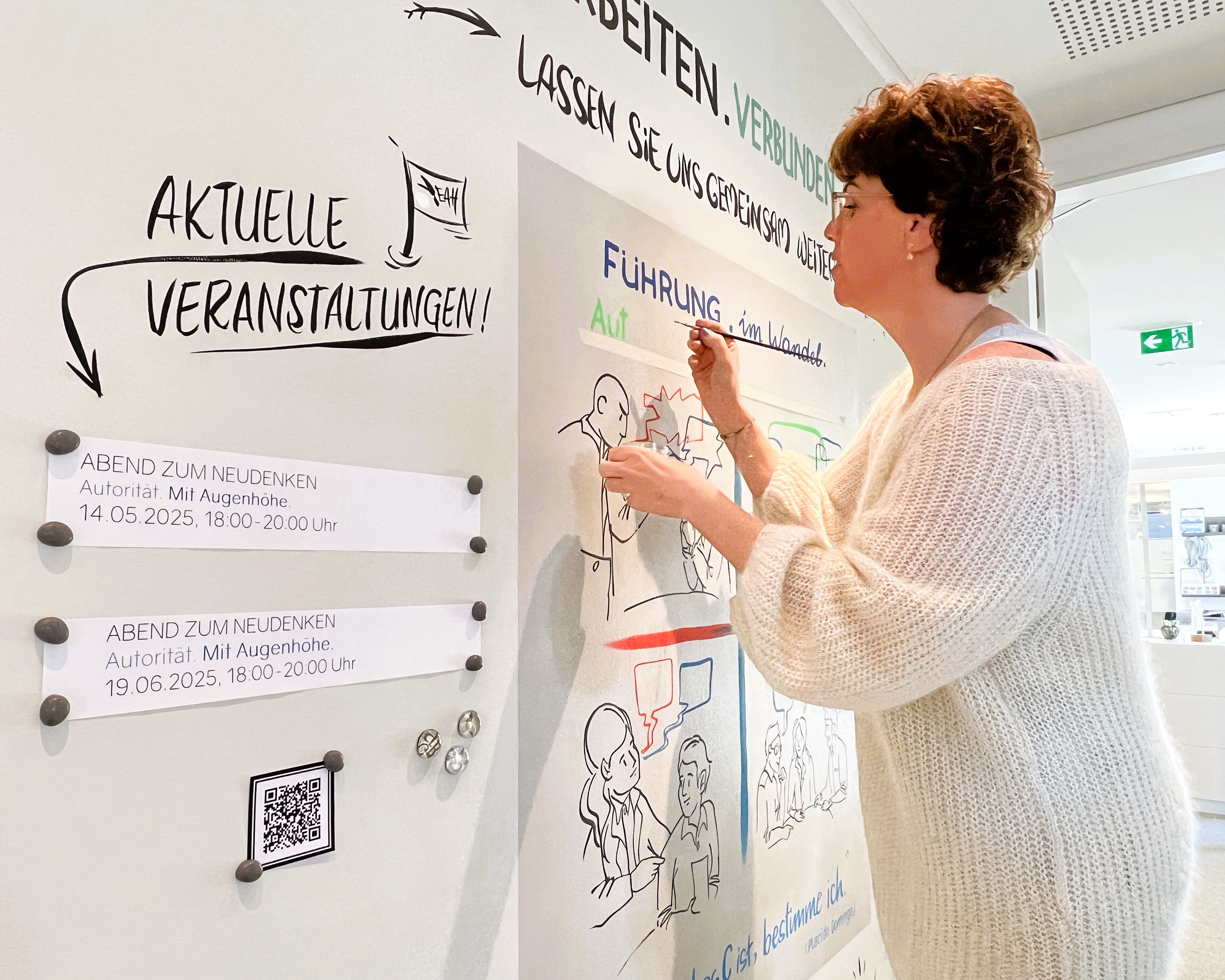 Nach intensivem Austausch zu unserem ersten Motto der Reihe "Führung. Im Wandel." in 2024 beschäftigen wir uns nun mit dem spannenden Thema “Autorität. Mit Augenhöhe“. Dazu haben wir gemeinsam mit Sabine Müller-Waltle (Businessillustrationen & Graphic Recording, WALTLEdesign.de) wieder ein Mottobild entwickelt. Passend dazu gibt es eine gestaltete Motto-Postkarte zum Mitnehmen und ein bunt gefülltes Literaturregal im Flur - kommen Sie vorbei und lassen Sie sich inspirieren!