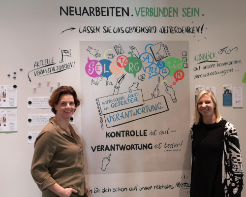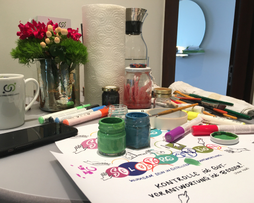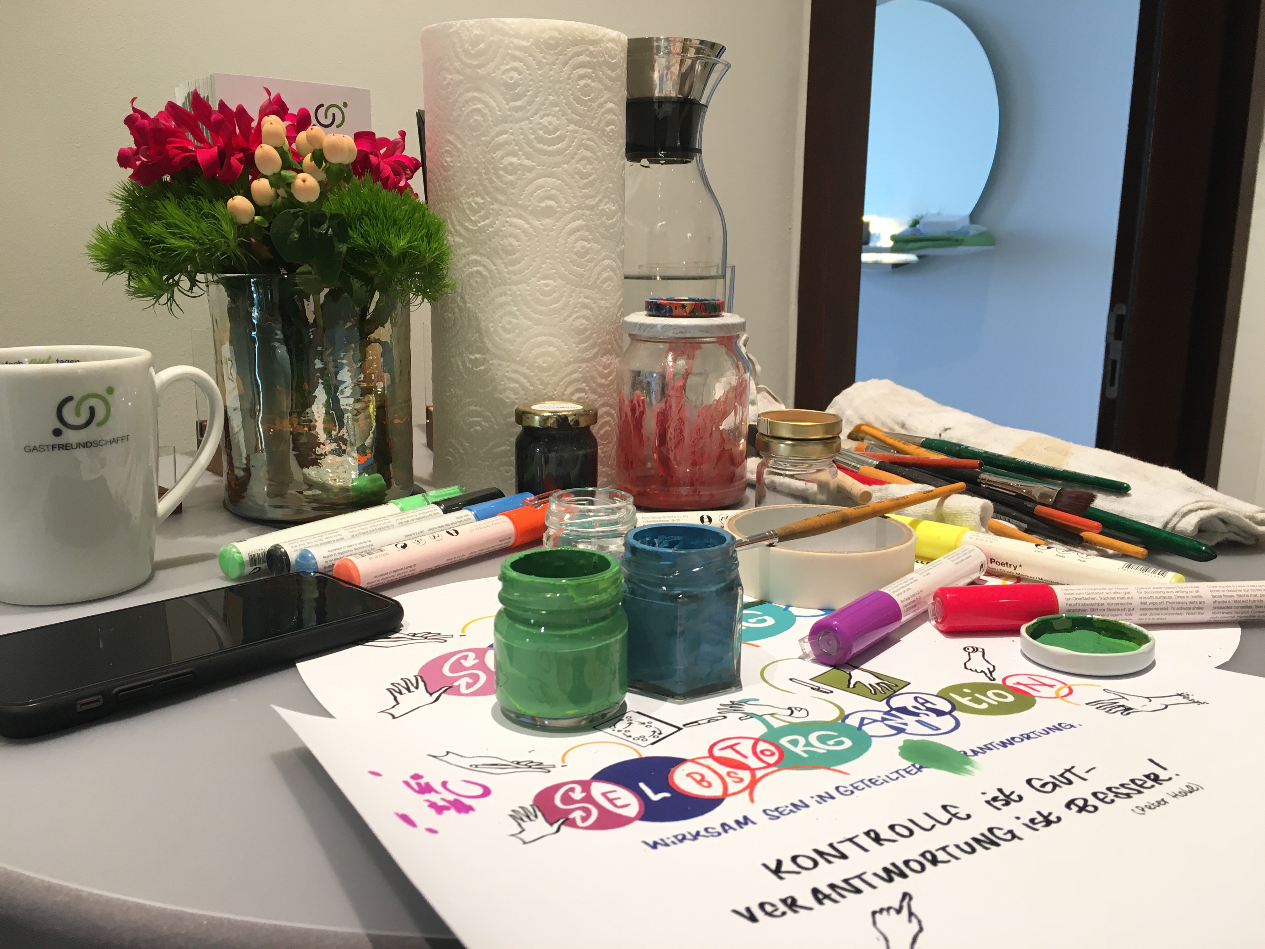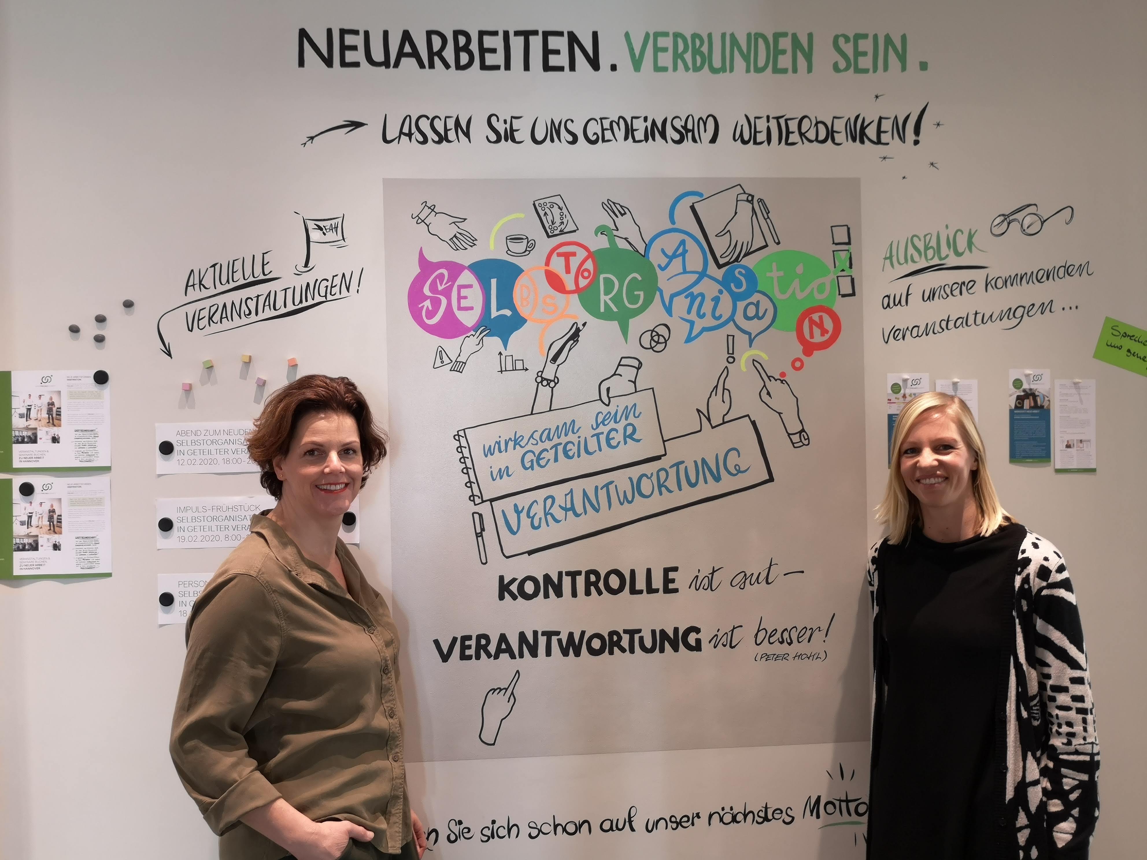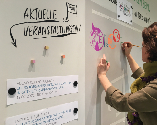Passend zum Thema "Selbstorganisation. Wirksam sein in geteilter Verantwortung." haben Anja Stamm (Gestaltende Neuer Arbeit bei GASTFREUNDSCHAFFT) und Sabine Müller-Waltle (Businessillustrationen & Graphic Recording, WALTLEdesign.de) wieder ein neues Mottobild entwickelt, das Sabine Müller-Waltle mit Spaß und Liebe zum Detail auf unsere Mottowand im Flur gebracht hat.