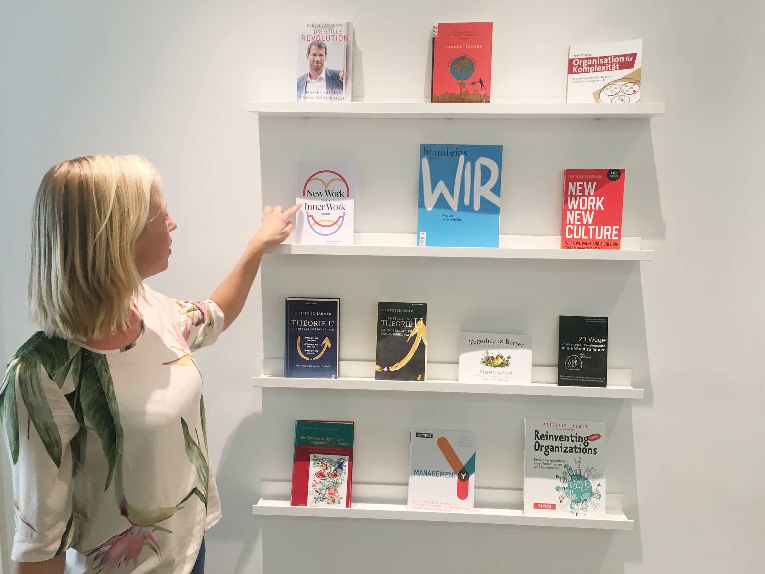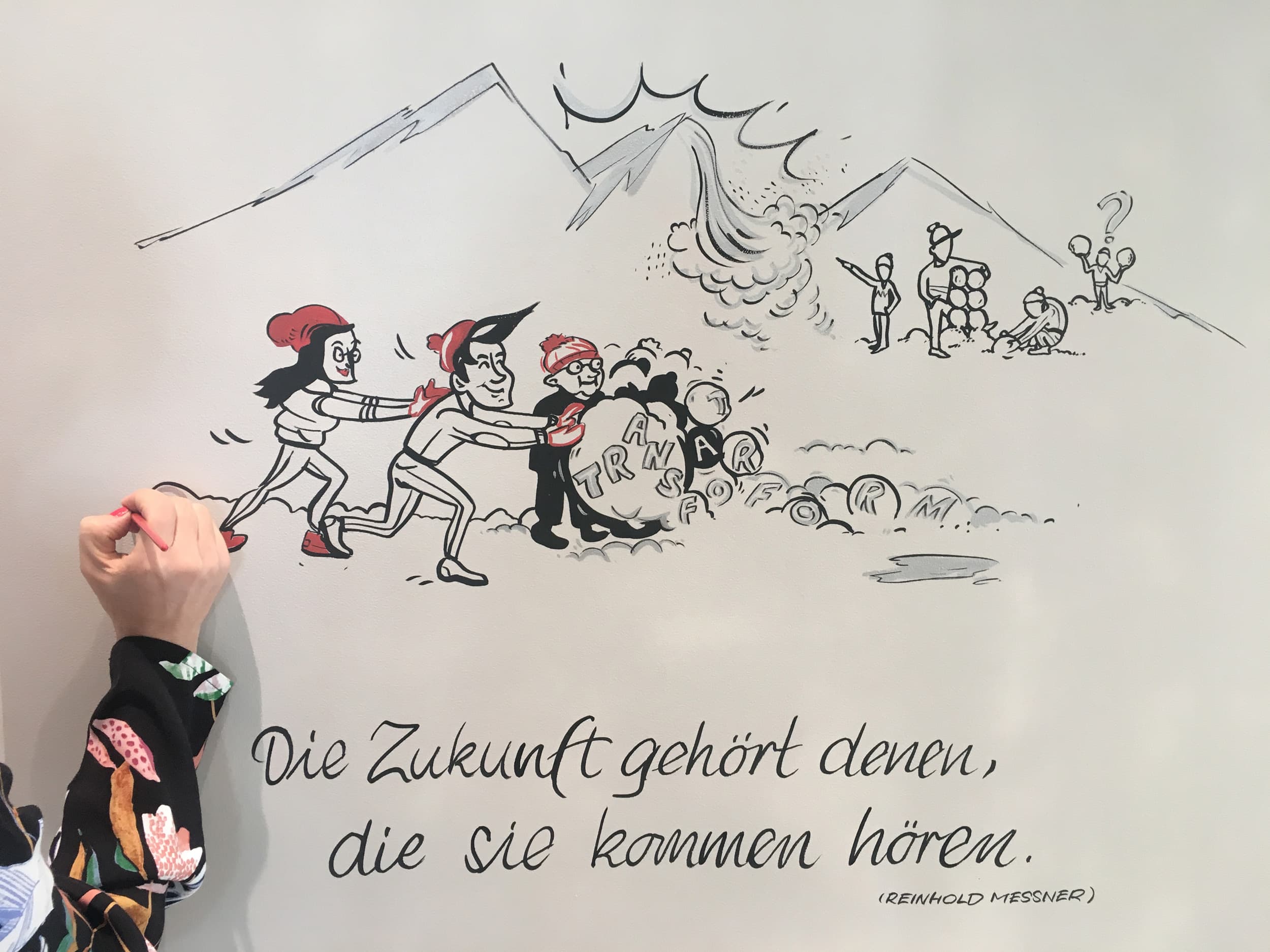 Ende September erhielt unsere Mottowand wieder ein neues Gewand! Zum Thema "Transformation gestalten. Durch Kultur" hat Sabine Müller-Waltle (Businessillustrationen & Graphic Recording, WALTLEdesign.de) ein neues Bild kreiert, das in gedanklicher Zusammenarbeit mit Anja Stamm (Gestaltende Neuer Arbeit bei GASTFREUNDSCHAFFT) entstanden ist. Passend zum Thema hatten wir wieder Literatur vor Ort für Sie zusammengestellt, die viele unserer Gäste inspirierend fanden.