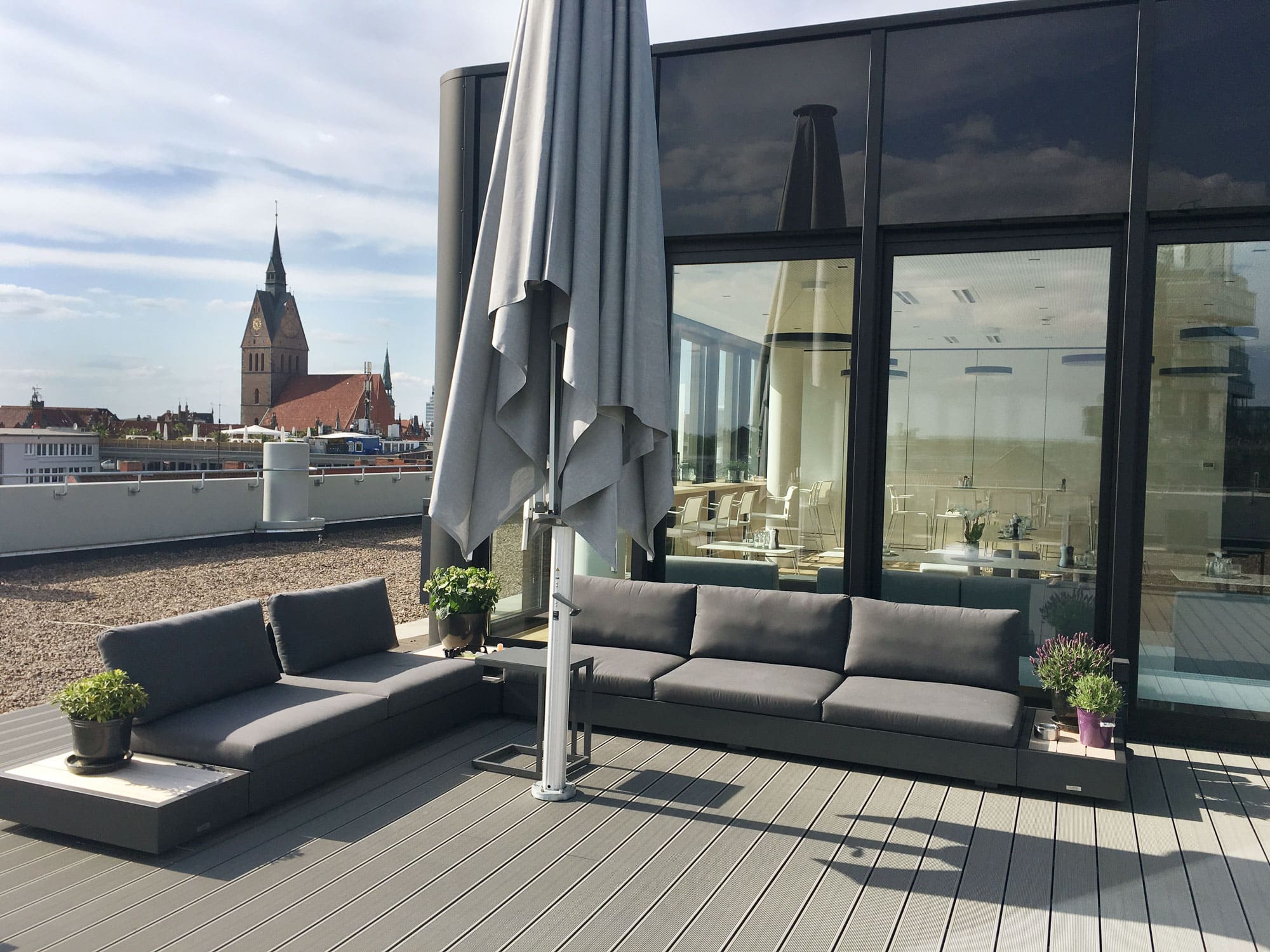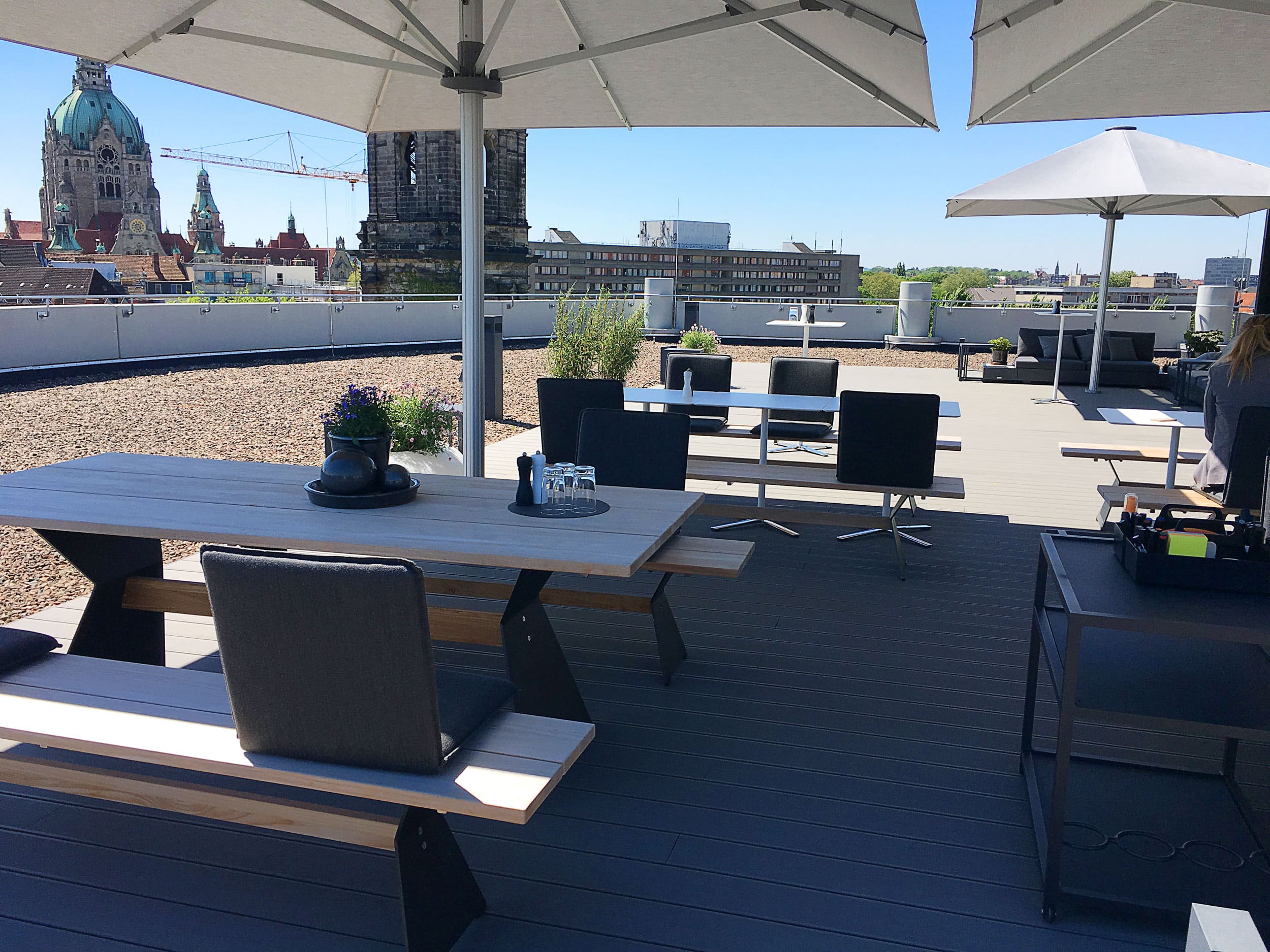 Genießen Sie den Blick aufs Neue Rathaus, die Aegidienkirche bis zum Deister. Völlig abgeschirmt vom Verkehrslärm der Stadt können Sie so auf unserer Dachterrasse tief durchatmen. Dies ermöglicht Ihnen in besonderer Weise ein konzentriertes und ungestörtes Arbeiten.