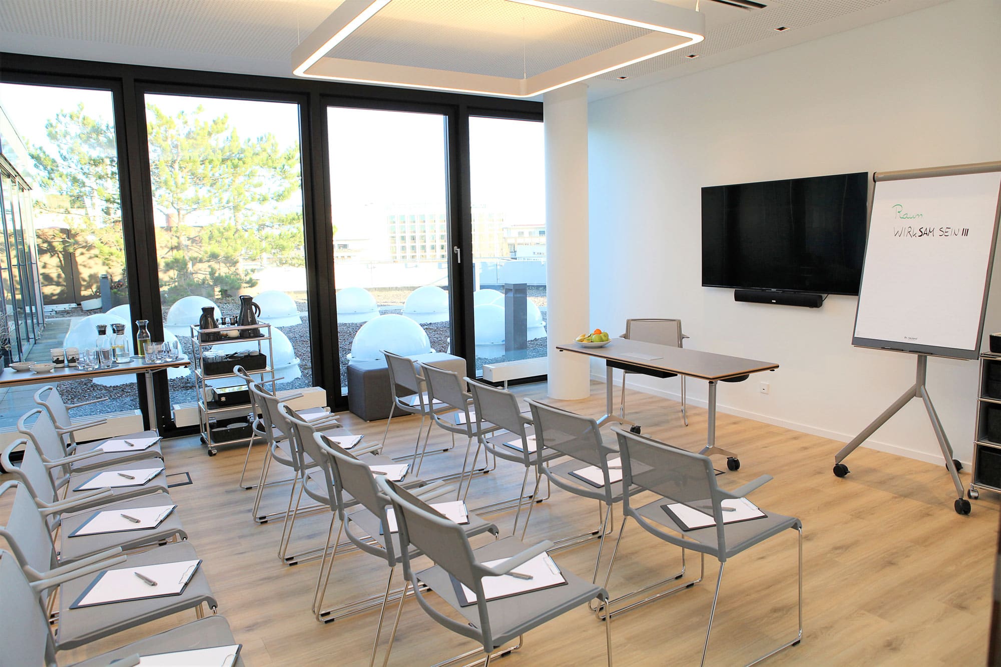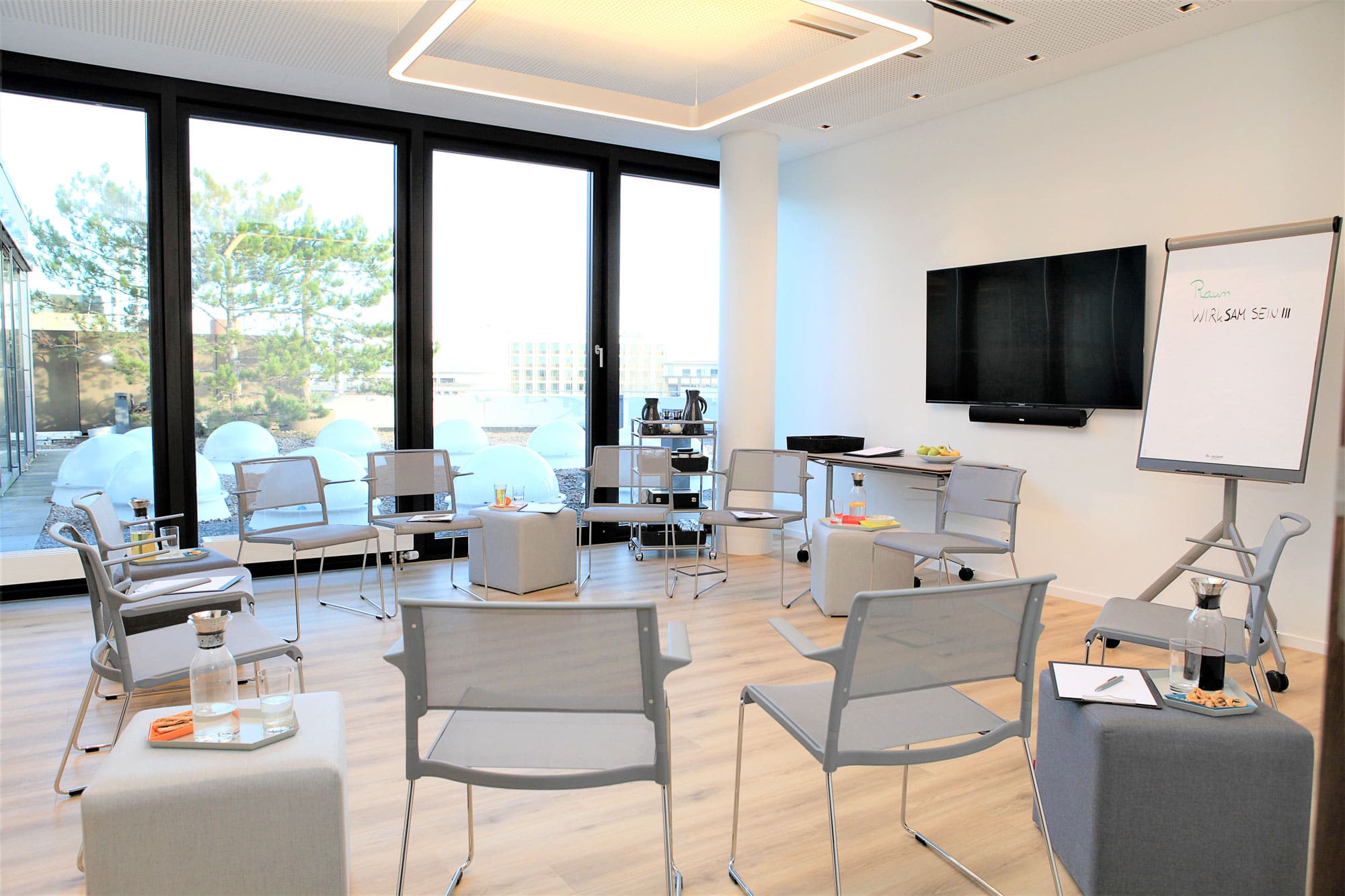 Damit Sie mit Ihrem Team auch bei räumlicher Distanz einiger TeilnehmerInnen in Beziehung sind und miteinander wirksam arbeiten können, sei es geplant oder spontan, ist die technische Umsetzung einer distanzüberwindenden Raumatmosphäre wichtig für ein stimmiges & vertrauensvolles Gruppengefühl. Dafür haben wir alle Räume mit professionellen USB-Konferenzsystemen mit herausragender 4K Videoqualität ausgestattet - unter dem Motto EINFACH.HYBRID.TAGEN.